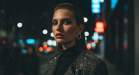 A stylish woman with slicked-back hair, wearing a chic outfit, poses confidently in a city at night with blurred lights in the background