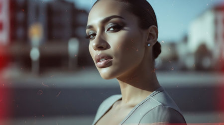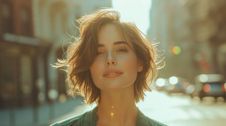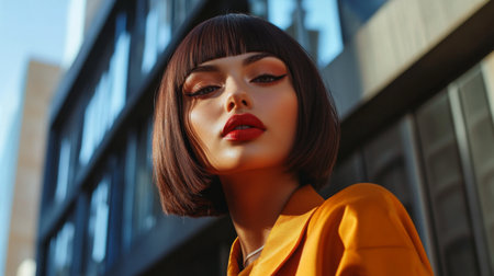 A stylish portrait of a woman with a chic bob haircut, wearing bold makeup and a fashionable outfit, set against a modern urban backdrop, exuding confidence.