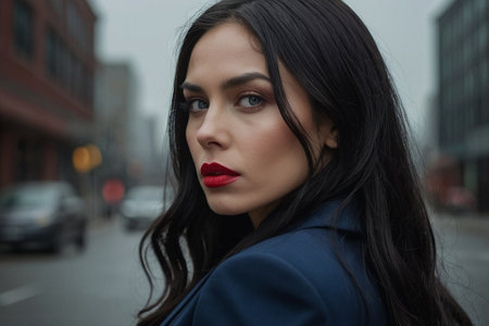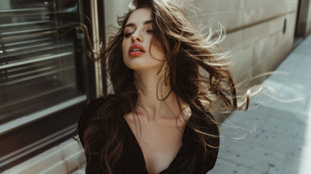 A woman with long hair is standing on a sidewalk. She is wearing a black dress and has red lipstick on. Concept of confidence and elegance, as the woman's long hair
