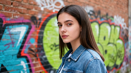Serious young brunette woman wearing blue denim jacket, sharply focused against a blurred, rough orange brick wall covered in vivid aerosol street art and neon colors.