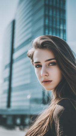 A young woman with long, brown hair looks directly at the camera with a serious expression. She is standing in front of a blurred, modern building with a glass facade.