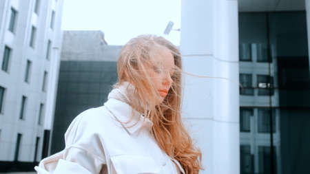A girl in a white coat and a scarf straightens her thick hair. Strong wind. Business center in the background. Success
