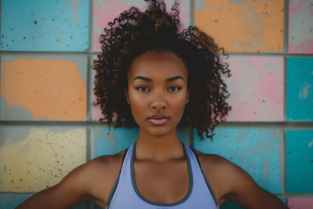 A woman with curly hair stands in front of a colorful wall. She is wearing a purple tank top and has her arms crossed. Concept of confidence and strength, as the woman stands tall