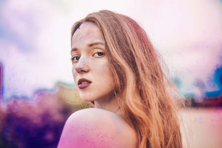 Portrait of beautiful young woman with freckles on her face , looking at camera. Girl with long hair and natural makeup.