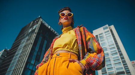 Fashionable woman in yellow jacket and sunglasses posing in the city