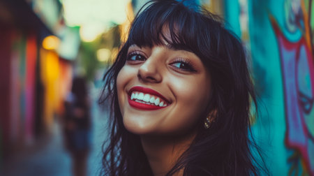 A close-up of a woman with stylish bangs framing her face, with a bright smile and vibrant lipstick, highlighting the trendy hairstyle and personality