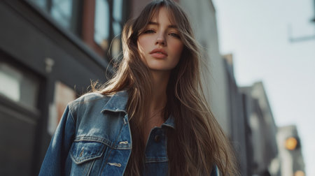 A fashionable woman with long hair showcases her denim style while confidently walking down an urban street on a bright and sunny day, radiating effortless coolness.