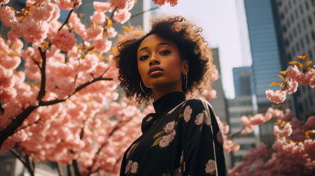 Modern happy young dark-skinned African woman with cherry blossoms in the background of a metropolis city. Businessman, spring blossoms, happiness joy dreaming love, Mental health, psychological treatment concept, positive thinking, good thoughts