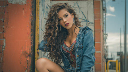 A young woman with wavy hair stands against a textured wall showcasing a confident expression. The warm light highlights her features capturing the essence of urban beauty at sunset.