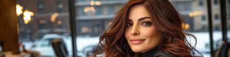 Confident woman with wavy auburn hair at a trendy winter urban salon, showcasing modern hairstyle