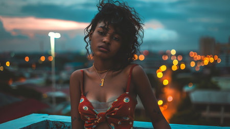 Young African American woman with a sorrowful expression standing against an urban evening backdrop with city lights. Concept of sadness, introspection, loneliness, and urban lifestyle.