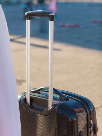 Cropped view of black suitcasevon city street. Business trip or holidays travel.