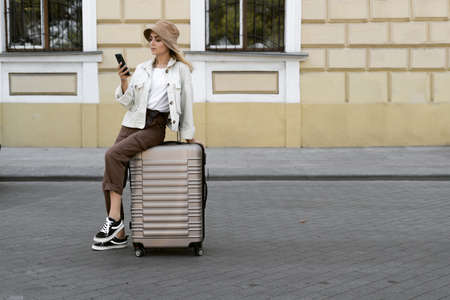tourist woman in a European city, tourism in Europe. a young girl dressed in a panama sits on a large suitcase reads a chat in a smartphone. Roaming. Copy space