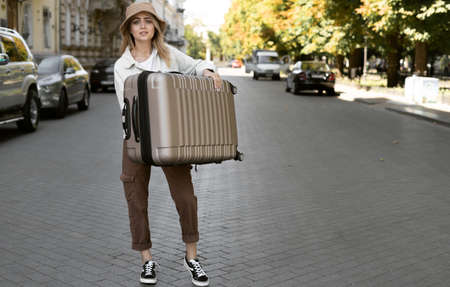 tourist woman on the street in a European city, tourism in Europe. Urban clothing style. Picks up a heavy suitcase. Place for text