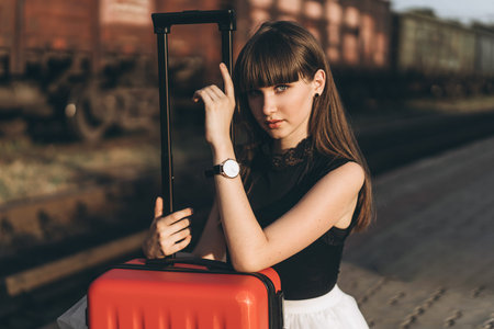 Female brunette traveler with red suitcase in white skirt waiting for a train on raiway station