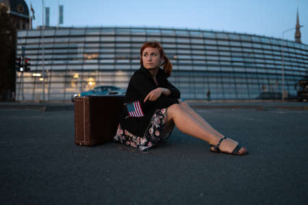 tourist woman with a suitcase in a European city, tourism in Europe. Sits on the sidewalk next to a large suitcase looking at the photographer. Place for text. Copy space.