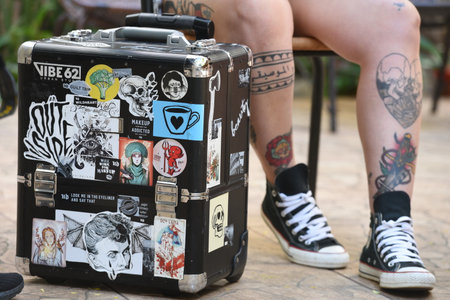 Goiania, Brazil - January 12, 2020 tattooed woman's legs with briefcase with stickers next to black sneakers