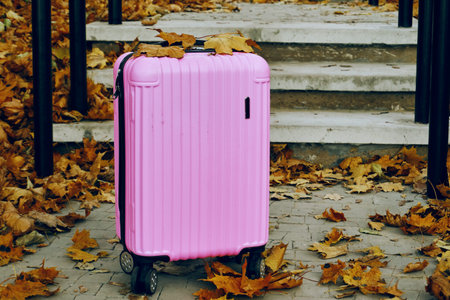 A pink suitcase stands on paving stones covered with dry autumn leaves. I travel and walk outdoors.