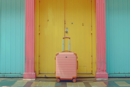Suitcase on a colorful geometric background. Plant. Travel concept. Free space for text. Banner. Created by ai