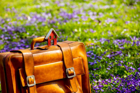 leather retro suitcase on a blurred background of nature / warm time for travel