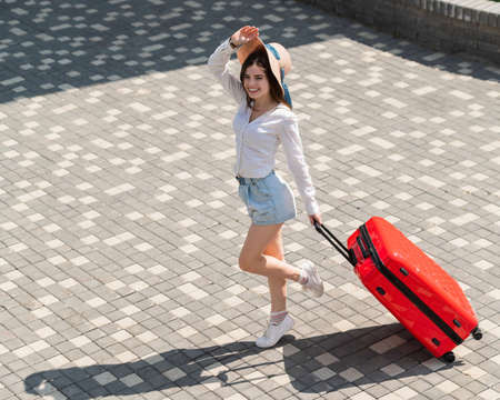 Happy caucasian young woman in hat and shorts holding a large red suitcase at an open age
