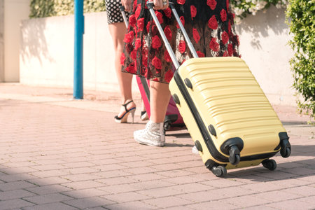 Cropped photo from below of two elegant tourist women walking with suitcases on the flowery street of the city.