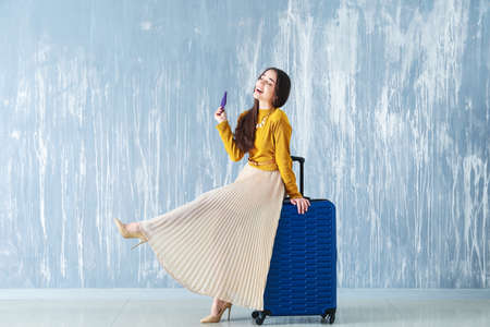 happy smiling girl traveler and her yellow luggage. wonderful travel