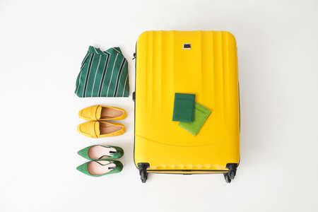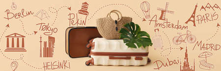 Packed suitcase, hat and photo camera on color background. Travel concept