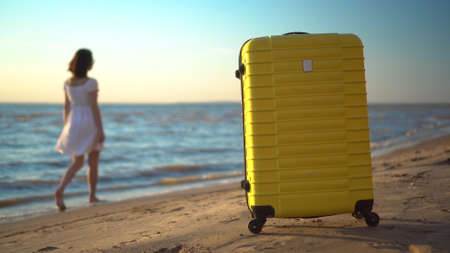A yellow suitcase stands on the beach against the background of the sea. Travel suitcase. A young woman in a white dress runs in the background.