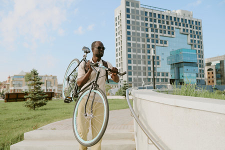 Young adult man carrying bicycle up stairs outdoors near modern office building, wearing sunglasses, walking with determined expression, urban cityscape in background