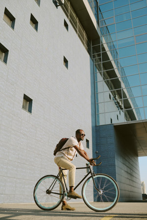 Young adult Black man riding bicycle outdoors near modern glass building, wearing backpack and sunglasses, smiling while looking forward, urban setting with clear sky
