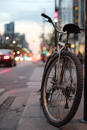 A bicycle rests against a pole on a city street, showcasing its tire and frame. The image has a shallow depth of field, with a blurred background of buildings, cars, and streetlights. The colors are muted, and the composition focuses on the bicycle in a possibly urban setting. Suitable for commercial or editorial applications.