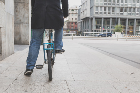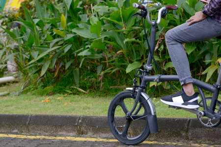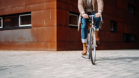 Midsection Close up leg shot of a businessman with bicycle commuting to the office. Modern building. Copyspace