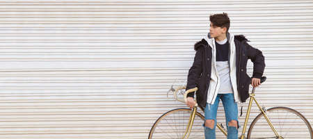 young teenage man with bicycle in the street in front of the background garage blind with space