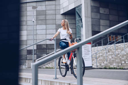 Woman cyclist walking beside riding bike on city road. Woman bike city