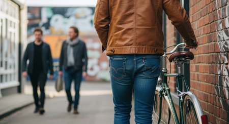 A person in a brown leather jacket standing next to a bicycle in an urban alley, with two men walking in the background, graffiti on the walls