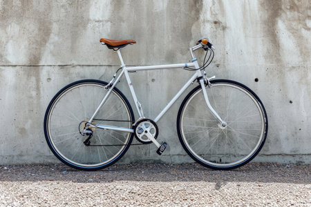 A white bicycle is propped against a plain concrete wall creating a striking contrast between the two elements, Side view of a bicycle against a minimal background, AI Generated
