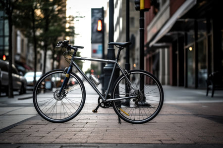 a close-up, uhd image of a bicycle parked on a street with a stunning sunset in the background. the vibrant colors of light crimson and red create a youthful and energetic atmosphere. this landscape-focused photo captures the detail-oriented beauty of the scene. get ready to experience the rtx on effect with this captivating image. ai generated