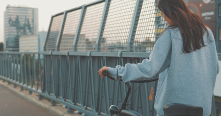 Young woman walking on city streets with bicycle , Urban biking, teenage girl and bike in town, sunset sunshine