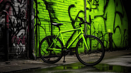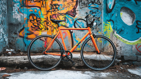 A bright orange bicycle rests against a vibrant graffiti wall, showcasing urban street art. This image captures the essence of modern city life and outdoor adventures.