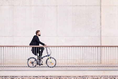 Businessman commuting by bicycle in a city, showcasing an eco-friendly and active lifestyle