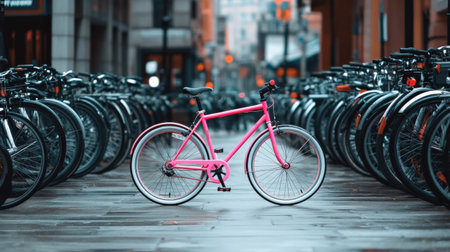 A neon pink bicycle parked among a row of plain grey bikes, representing uniqueness in everyday life