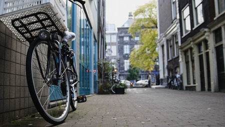 View bicycle standing in the yard on Amsterdam, sunny european autumn