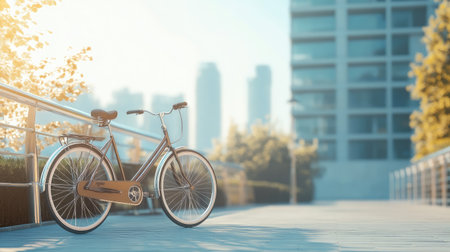 A vintage bicycle stands on a serene urban pathway, basking in sunlight. This image captures the essence of leisure and exploration in a modern cityscape.