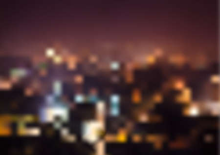 Blurred background of night city. Light of houses, glare of road lighting.