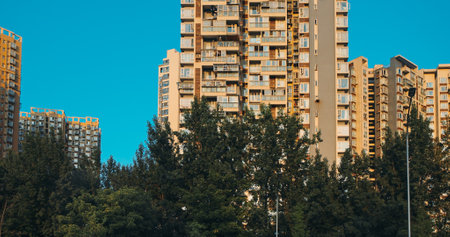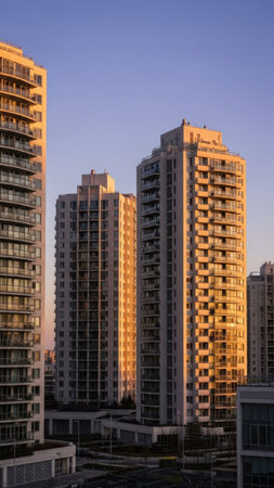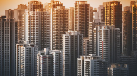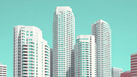 An upward perspective captures tall skyscrapers against a clear sky. The image showcases the repetitive facades of the buildings and emphasizes their height. The color palette consists of neutral tones, possibly depicting a cityscape environment. Suitable for a range of commercial applications, this image conveys urban themes.