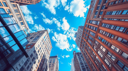 An upward perspective captures a cluster of towering skyscrapers. The buildings exhibit a symmetrical arrangement. The composition highlights the geometric lines. Ideal for visual representations, this image could be suitable for various commercial or editorial applications.