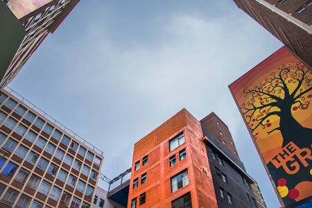 Johannesburg / South Africa - November 19 2016: the tops of orange buildings against a blue sky in the city centre