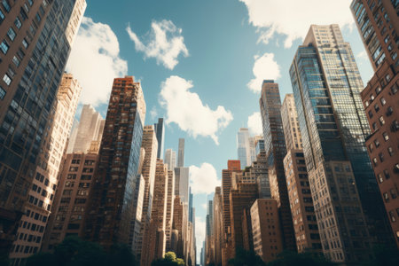 Generative AI : Looking up at Manhattan skyscrapers at sunset color toning applied New York City USA