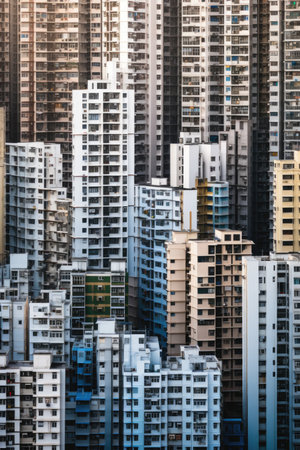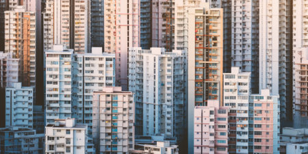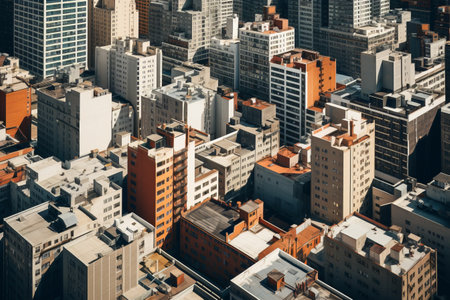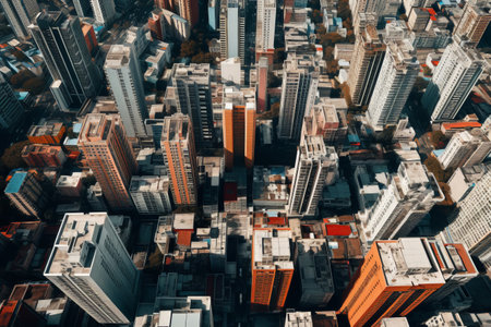 Top-down view of modern skyscrapers, captured on 35mm film. The urban landscape showcases architectural progress and city dynamics. Created with generative AI tools